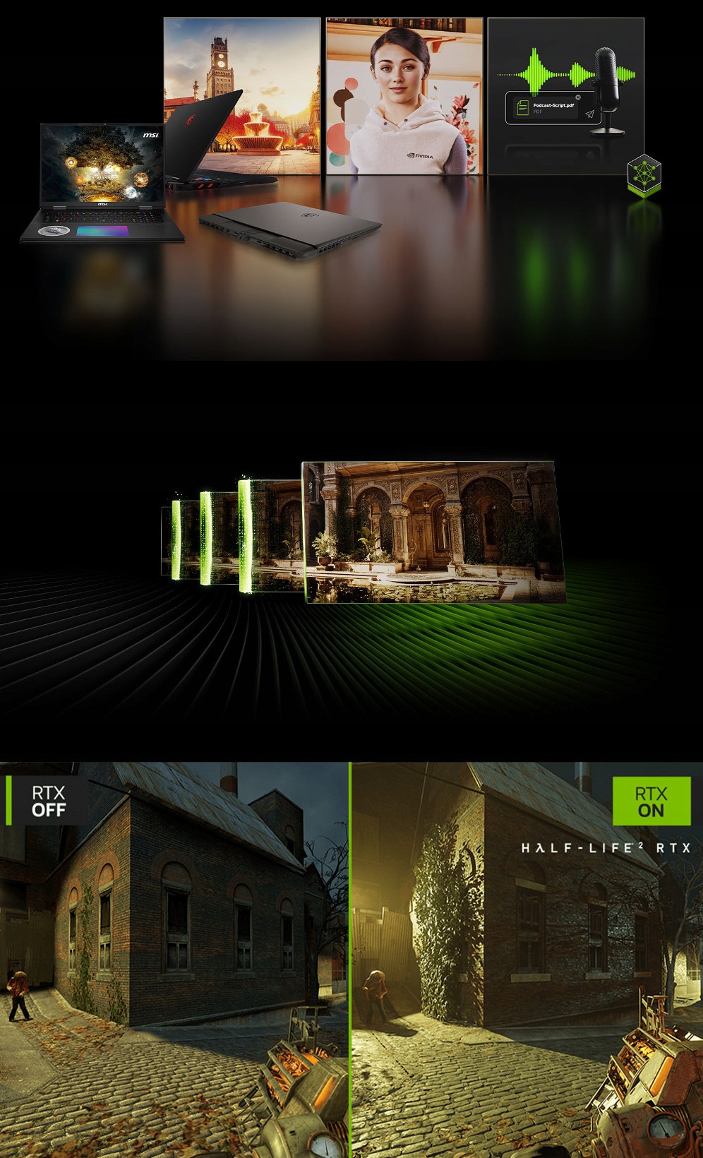 NVIDIA DLSS to rewolucyjny zestaw funkcji renderowania neuronowego, który wykorzystuje sztuczną inteligencję do zwiększenia liczby generowanych klatek na sekundę, zmniejszenia opóźnień i poprawy jakości obrazu. DLSS 4 oferuje nową generację technologii Multi Frame Generation oraz ulepszoną technikę rekonstrukcji promieni i super-rozdzielczość, które udostępniane są przez procesory graficzne GeForce RTX™ z serii 50 i rdzenie Tensor piątej generacji. DLSS dostępny na platformie GeForce RTX™ to najlepszy sposób na niesamowite rozgrywki. Co więcej, technologia ta wspierana jest przez superkomputer NVIDIA AI w chmurze i stale zwiększa gamingowe możliwości Twojego laptopa.